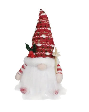 The green hat gnome holds a pair of skis and wears a green and white stitched hat adorned with a sprig of holly and red berries. The red hat gnome carries ski sticks and wears a matching red and white stitched hat, also finished with holly details. Crafted with care, these charming gnomes are perfect for mantels, shelves, or tabletops, bringing cozy Scandinavian style and festive cheer to your home.