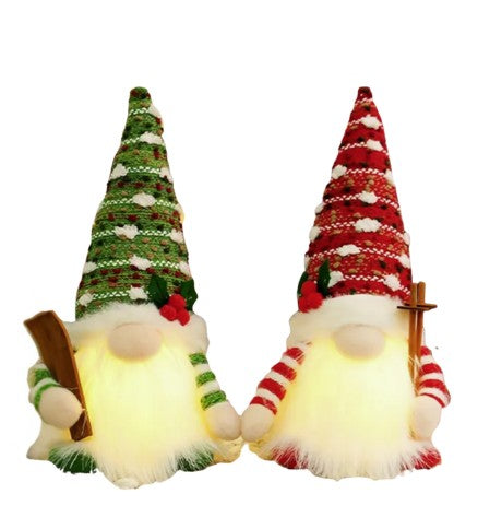 Add a magical glow to your festive décor with these adorable LED Christmas gnomes. Each gnome stands approximately 30 cm high and 10 cm wide, featuring a cozy stitched-pattern hat, soft white beard, and wooden ski accessories. The built-in LED lights softly illuminate their round bodies, casting a warm, inviting glow that instantly enhances any Christmas display.